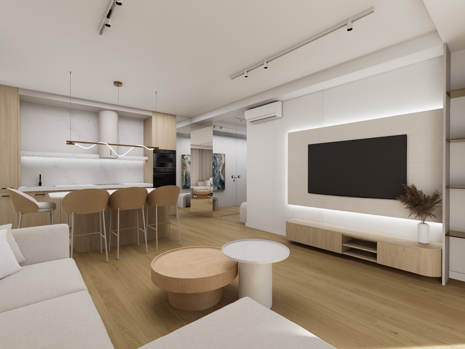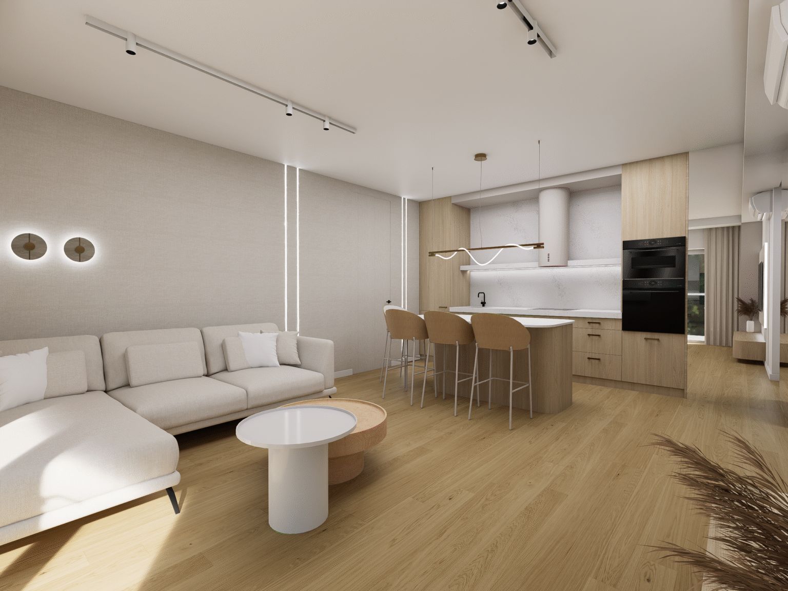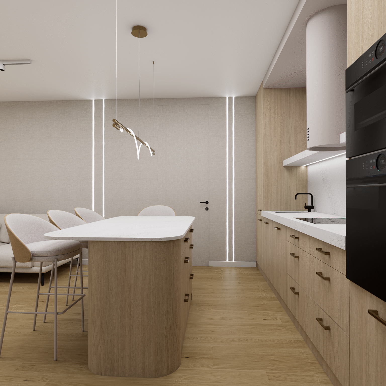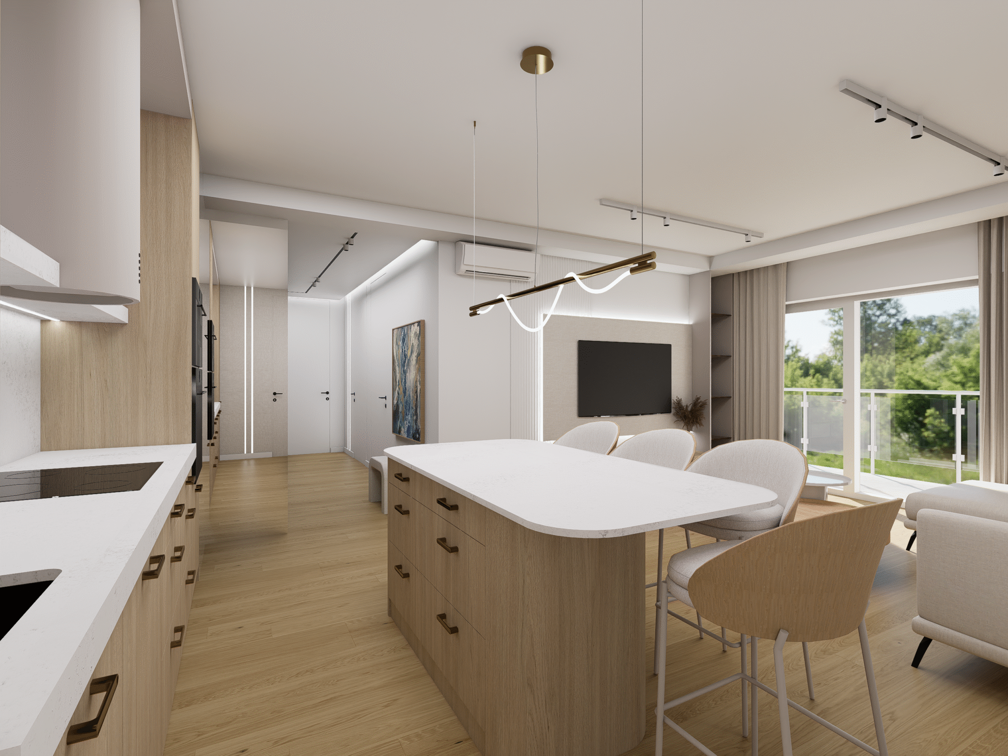 subtelnym „śladem” przewijającym się przez wszystkie strefy mieszkania. Celem było stworzenie wnętrza eleganckiego, ale nie przytłaczającego — miejsca, które emanuje ciepłem, klasą i ponadczasowym stylem. Salon z aneksem kuchennym to serce mieszkania. Jasna, neutralna baza kolorystyczna (biel, ciepłe beże, jasny dąb) została przełamana złotymi akcentami w postaci lamp, uchwytów meblowych oraz detali wykończeniowych. Sofa, której tkanina przeplata w sobie kilka odcieni beżu i bieli, lekko mieniące się zasłony i aksamitne poduszki nadają przestrzeni elegancji. Kuchnia to połączenie drewnianych frontów z białymi blatami z konglomeratu z delikatnym, unikatowym szaro-czarnym wzorem. W sypialni króluje spokój i harmonia. Centralnym punktem jest łóżko z tapicerowanym zagłówkiem do sufitu w kolorze taupe, z pionowym przeszyciem w stylu art déco. Po obu stronach – kinkiety z czarnego przydymionego szkła o organicznych kształtach. Całość dopełnia delikatna tapeta o fakturze lnu i teksturalny obraz na ścianie. Szafa wnękowa z lustrzanymi grafitowymi drzwiami powiększa optycznie przestrzeń, a złote uchwyty utrzymują spójność stylistyczną z resztą wnętrza. Projekt „Golden Trace” to hołd dla elegancji w nowoczesnym wydaniu. Złote akcenty są tutaj niczym biżuteria — nie dominują, ale podkreślają charakter wnętrza. Mieszkanie zostało zaprojektowane z myślą o osobach ceniących wyrafinowaną estetykę, komfort oraz detale, które tworzą całość.