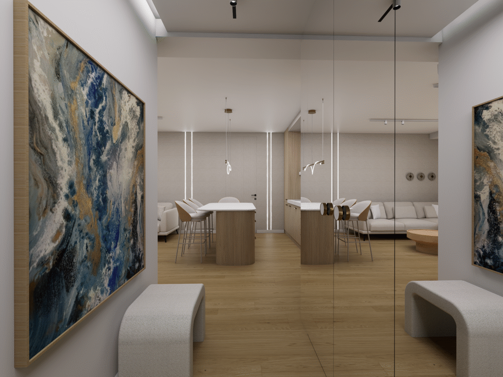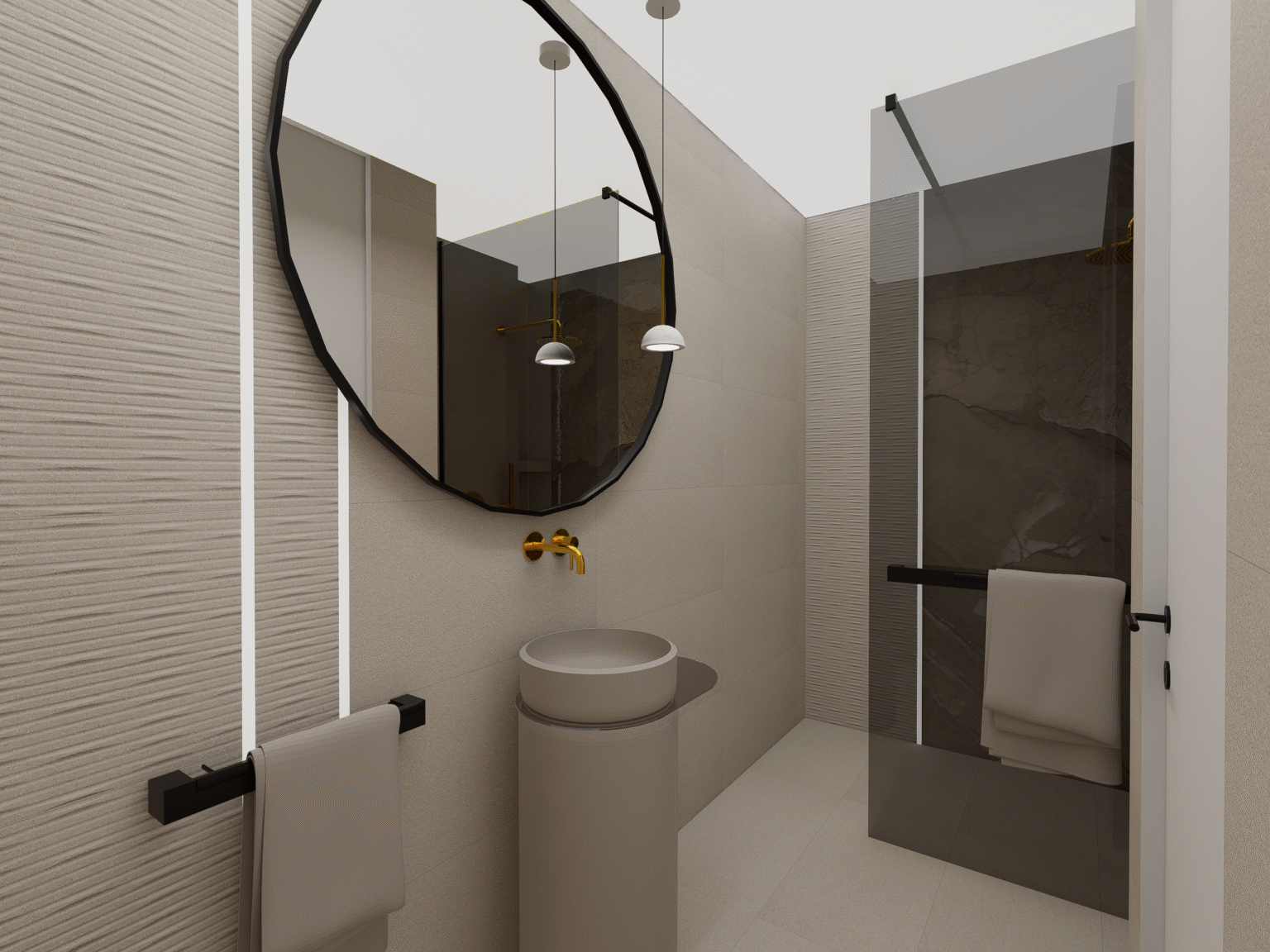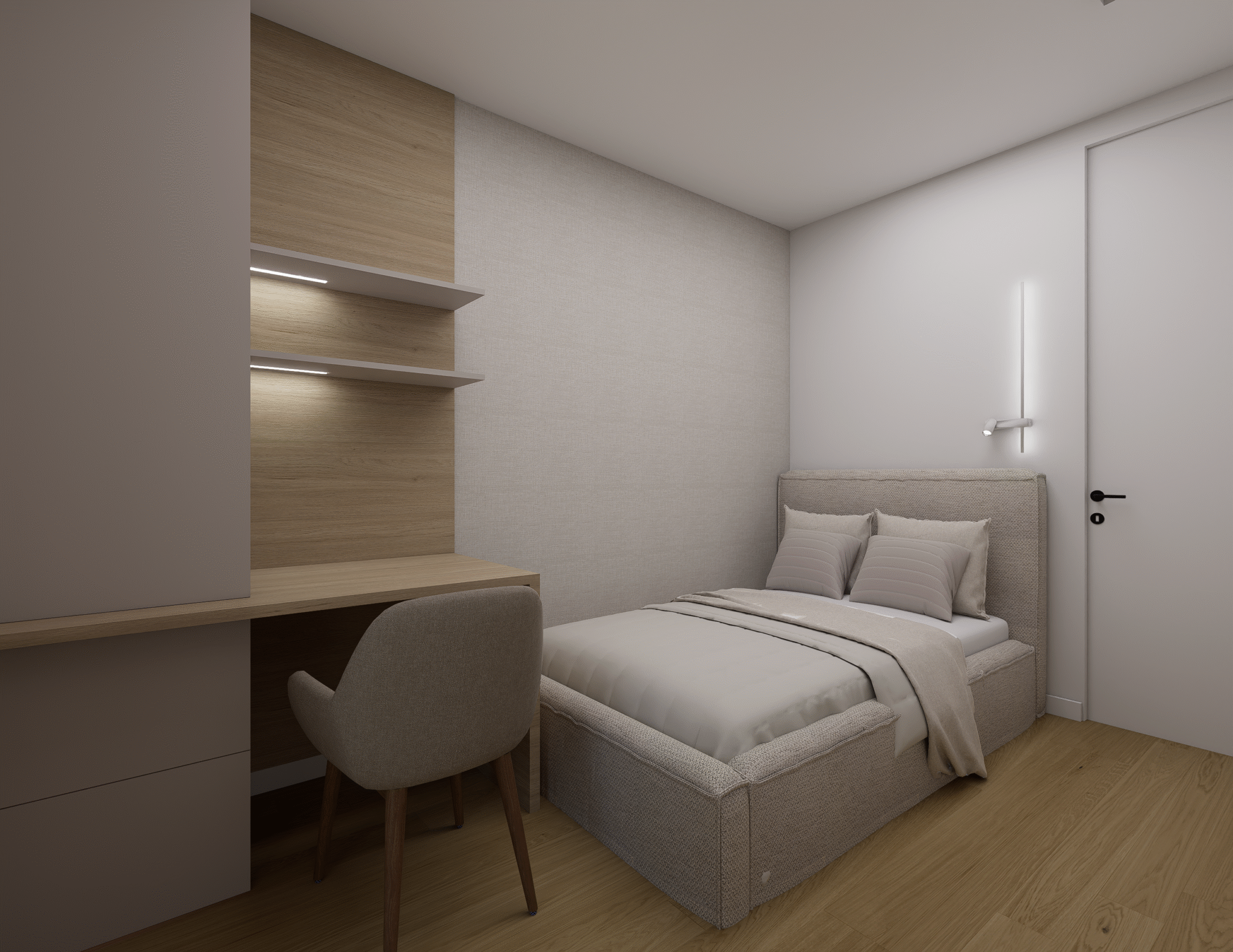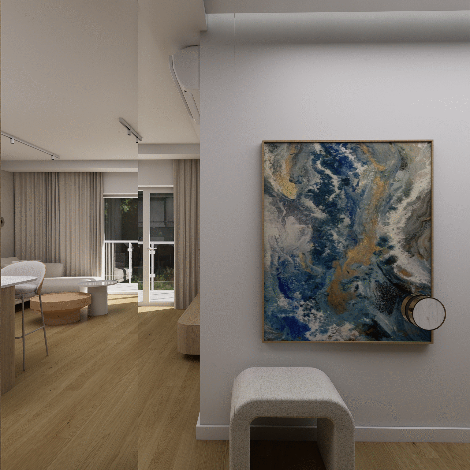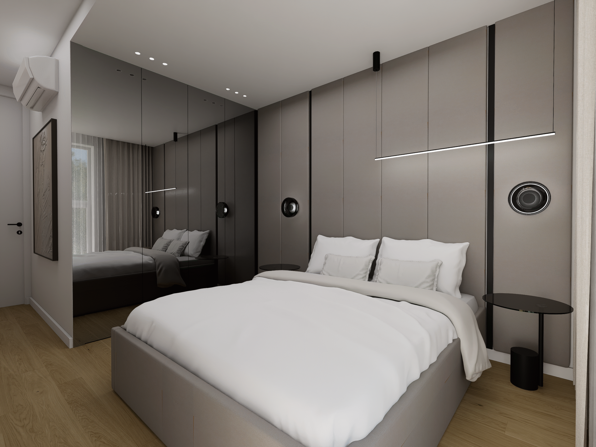 subtelnym „śladem” przewijającym się przez wszystkie strefy mieszkania. Celem było stworzenie wnętrza eleganckiego, ale nie przytłaczającego — miejsca, które emanuje ciepłem, klasą i ponadczasowym stylem. Salon z aneksem kuchennym to serce mieszkania. Jasna, neutralna baza kolorystyczna (biel, ciepłe beże, jasny dąb) została przełamana złotymi akcentami w postaci lamp, uchwytów meblowych oraz detali wykończeniowych. Sofa, której tkanina przeplata w sobie kilka odcieni beżu i bieli, lekko mieniące się zasłony i aksamitne poduszki nadają przestrzeni elegancji. Kuchnia to połączenie drewnianych frontów z białymi blatami z konglomeratu z delikatnym, unikatowym szaro-czarnym wzorem. W sypialni króluje spokój i harmonia. Centralnym punktem jest łóżko z tapicerowanym zagłówkiem do sufitu w kolorze taupe, z pionowym przeszyciem w stylu art déco. Po obu stronach – kinkiety z czarnego przydymionego szkła o organicznych kształtach. Całość dopełnia delikatna tapeta o fakturze lnu i teksturalny obraz na ścianie. Szafa wnękowa z lustrzanymi grafitowymi drzwiami powiększa optycznie przestrzeń, a złote uchwyty utrzymują spójność stylistyczną z resztą wnętrza. Projekt „Golden Trace” to hołd dla elegancji w nowoczesnym wydaniu. Złote akcenty są tutaj niczym biżuteria — nie dominują, ale podkreślają charakter wnętrza. Mieszkanie zostało zaprojektowane z myślą o osobach ceniących wyrafinowaną estetykę, komfort oraz detale, które tworzą całość.